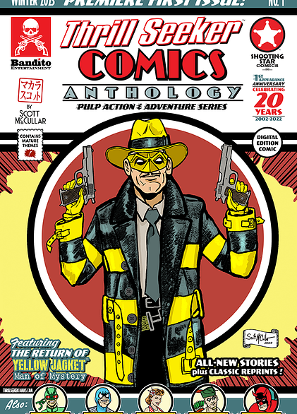 It all starts here with the premiere first issue of THRILL SEEKER COMICS ANTHOLOGY™ by writer/artist Scott McCullar. At the center of these two-fisted tales is the Dust Bowl era vigilante known as THE YELLOW JACKET: MAN OF MYSTERY™, who pursued by lawmen, is conscripted into THE STAR-SPANGLED SQUADRON™ to battle Axis Powers during the outbreak of World War Two alongside the EMERALD MANTIS™ and SACRED SCARAB™. Also, meet the dame detective MS. TITTENHURST: FINDER OF LOST THINGS™ in a brand-new story leading up to her first case. THRILL SEEKER COMICS was first released just over twenty years ago in the acclaimed indie comic series SHOOTING STAR COMICS ANTHOLOGY™ as one of the regular features in every issue. Now rebooted, THRILL SEEKER COMICS returns in this relaunch with all-new stories alongside reprints with two classic original tales that have been remastered.