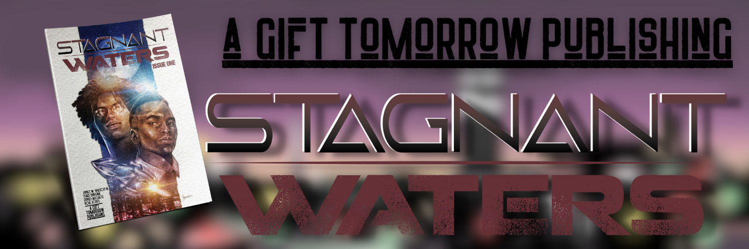 James is a writer, or at least that’s what he believes. He’s only just breaking into the comic book industry but he’s kicking the door down with features in Fugitive Poems’ Containment Breach 4 and of course the Stagnant Waters book that you’ve come to support. He’s also the owner of A Gift Tomorrow Publishing, a company geared towards giving voices to new and old authors and artists alike. Follow James and A Gift Tomorrow Publishing on Twitter (@JamesWTheWriter / @AGTPublishing).